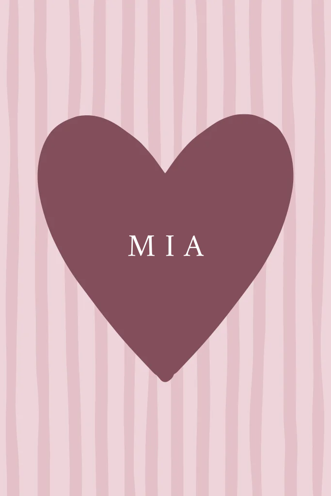 Lief kaartje in roze met smalle streepjes en één groot hart in het midden. Mia
