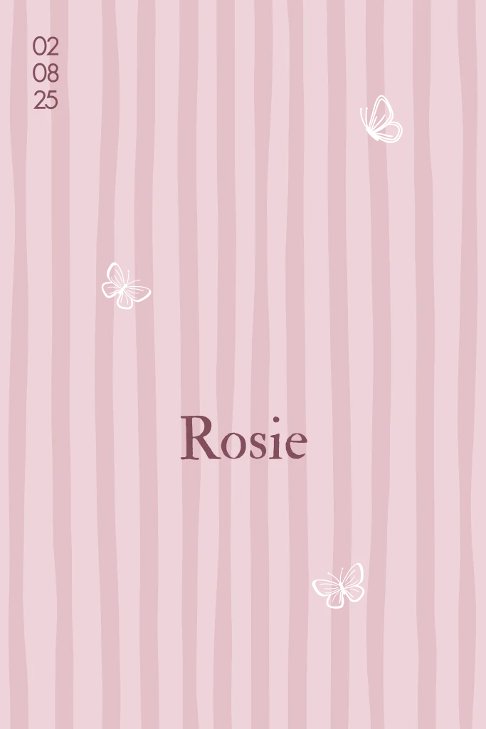 Vrolijk roze geboortekaartje met lieve streepjes en kleine vlinders. Lekker fris en heel lief. Rosie