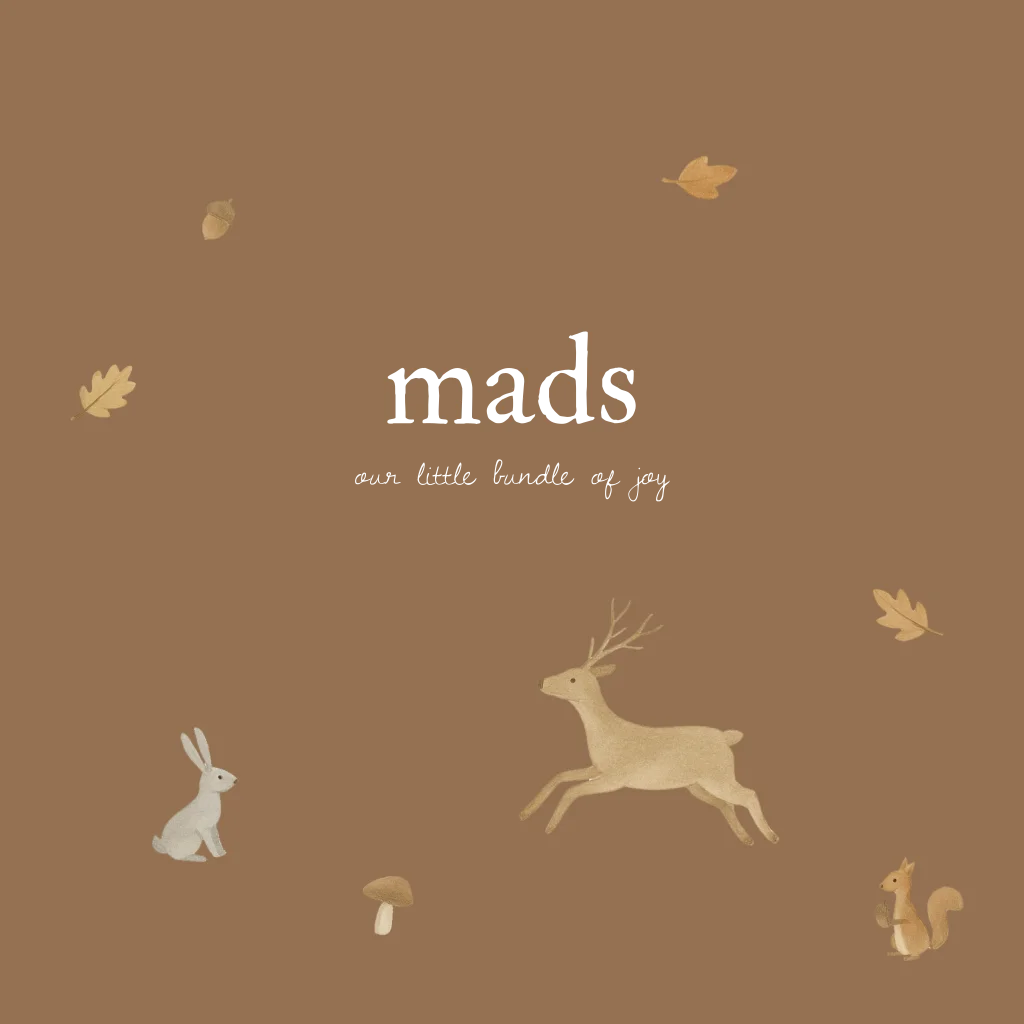 Een lief geboortekaartje met bosdieren, pas het ontwerp aan in onze online editor voor jouw kleintje. Mads