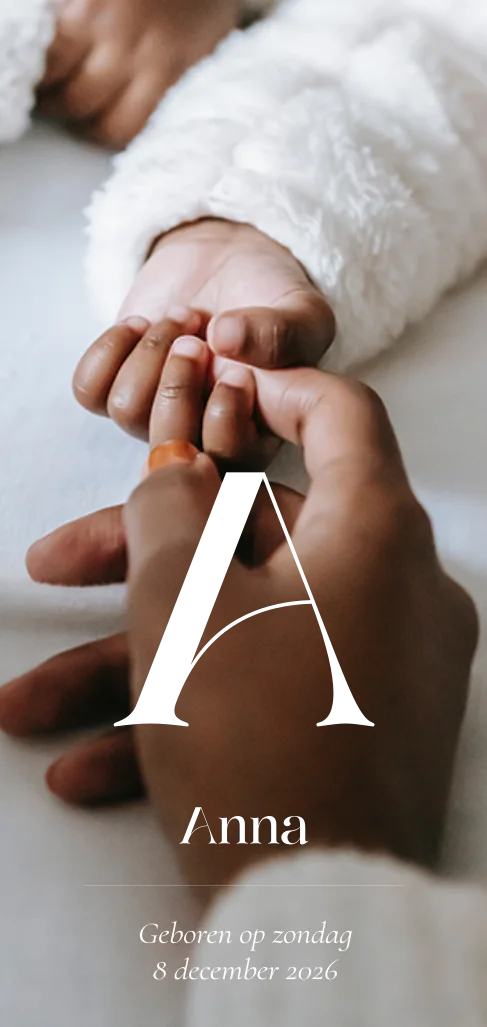 Dit langwerpige geboortekaartje met foto en letter is een stijlvolle en moderne manier om de geboorte van jullie kleintje aan te kondigen. Met zijn langwerpige formaat valt het direct op en trekt het de aandacht. De centrale focus ligt op de prachtige foto van jullie baby, waarbij elke glimlach en schattig detail tot leven komt. De grote letter, gedrukt in goudfolie, voegt een sprankelend tintje toe en benadrukt de naam van jullie kindje. Dit geboortekaartje biedt genoeg ruimte voor belangrijke details zoals de geboortedatum, gewicht en lengte, en laat een blijvende indruk achter bij de ontvangers, vol warmte en liefde.