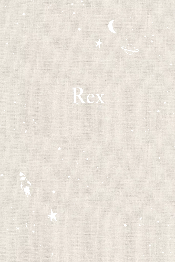 Dit geboortekaartje met linnenlook en een ruimte-thema heeft een elegante, natuurlijke uitstraling. Personaliseer het met de naam van je baby en creëer een uniek aandenken aan een bijzondere geboorte. Rex