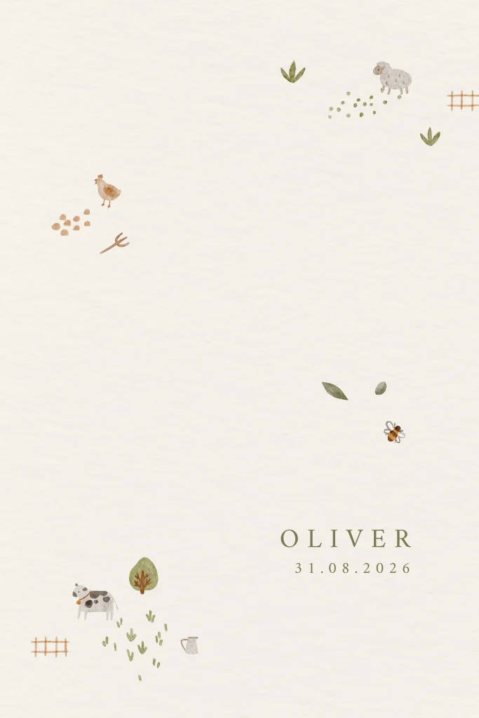 Een fris en eenvoudig geboortekaartje met schattige boerderijdieren. Leuk voor een landelijke sfeer met een moderne uitstraling. Oliver