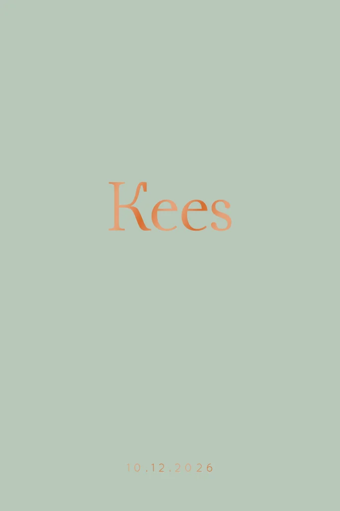 Dit eenvoudige geboortekaartje in pastel groen met subtiele koperfolie accenten is perfect voor ouders die van minimalisme houden. Het simpele ontwerp benadrukt de belangrijkste details en zorgt ervoor dat de aandacht naar de naam, geboortedatum en gewicht van de baby gaat. Het simpele geboortekaartje past goed bij verschillende thema's en is gemakkelijk te personaliseren. Dit simpele geboortekaartje is een tijdloze keuze voor de aankondiging van de geboorte van jullie kleintje. Bestel vandaag nog jullie eigen simpele geboortekaartje en maak de aankondiging van jullie baby zo speciaal als jullie willen!