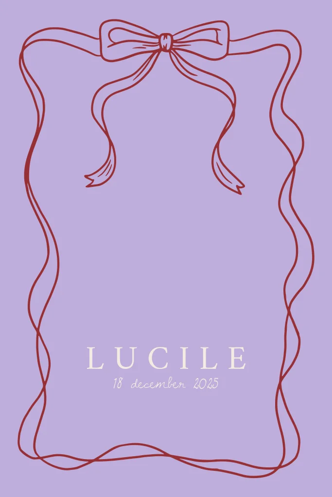 Een lief geboortekaartje met lavendel en strik. Pas het ontwerp naar wens aan in onze online editor. Lucile