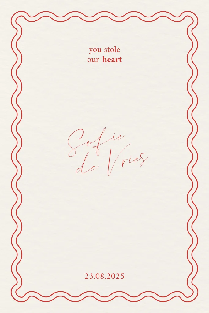 Een gebroken wit kaartje met een rode rand, net een liefdesbriefje. Simpel en superlief. Sofie