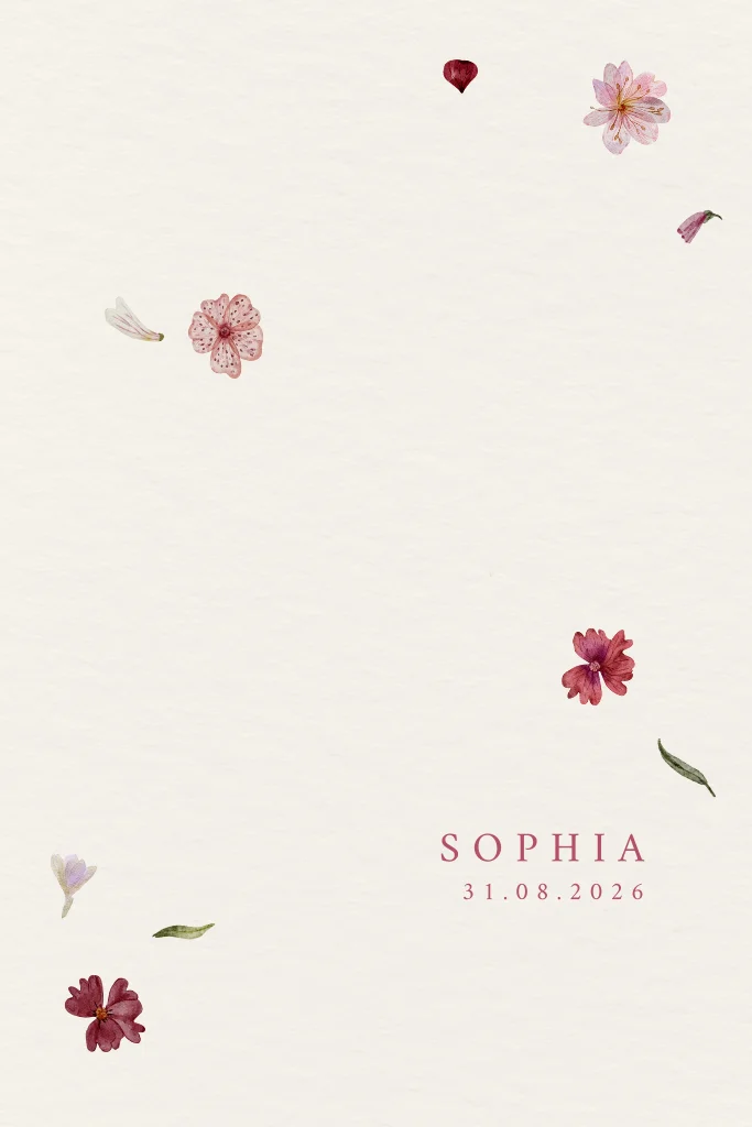 Een stijlvol geboortekaartje met een rustige vormgeving en subtiele droogbloemen. Een moderne en tijdloze keuze voor een serene aankondiging. Sophia