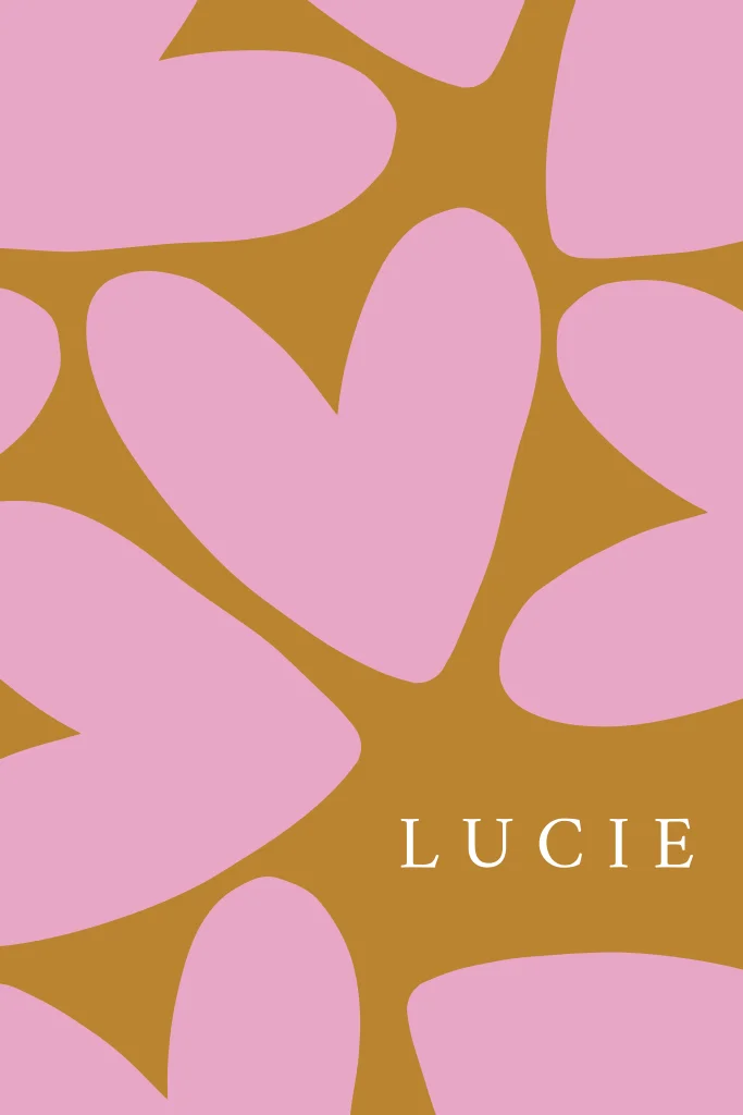 Een stoer mosterdkleurig geboortekaartje met grote roze hartjes. Warm en vrolijk tegelijk. Lucie