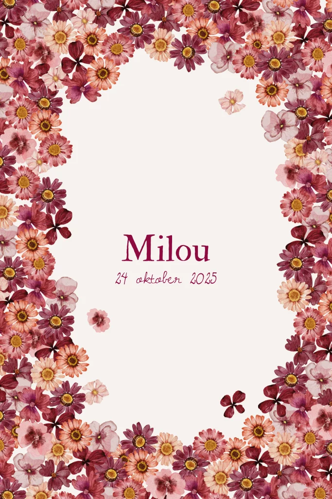 Een warm en kleurrijk geboortekaartje met een sierlijke rand van rode en roze bloemen. Dit romantische ontwerp straalt liefde en vrolijkheid uit en is perfect voor een zachte en feestelijke geboorteaankondiging. Milou
