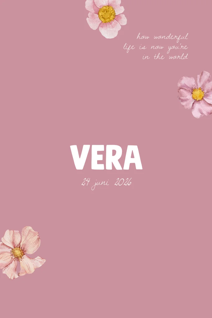 Een zacht en liefdevol geboortekaartje in staand formaat, met roze tinten en fijne bloemenillustraties. Ideaal voor een warme en dromerige geboorteaankondiging. Vera