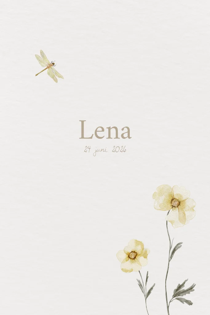 Een lief geboortekaartje met twee kleurrijke veldbloemen en een sierlijke libelle. Perfect voor een natuurlijke, zachte geboorteaankondiging met een romantische uitstraling. Lena