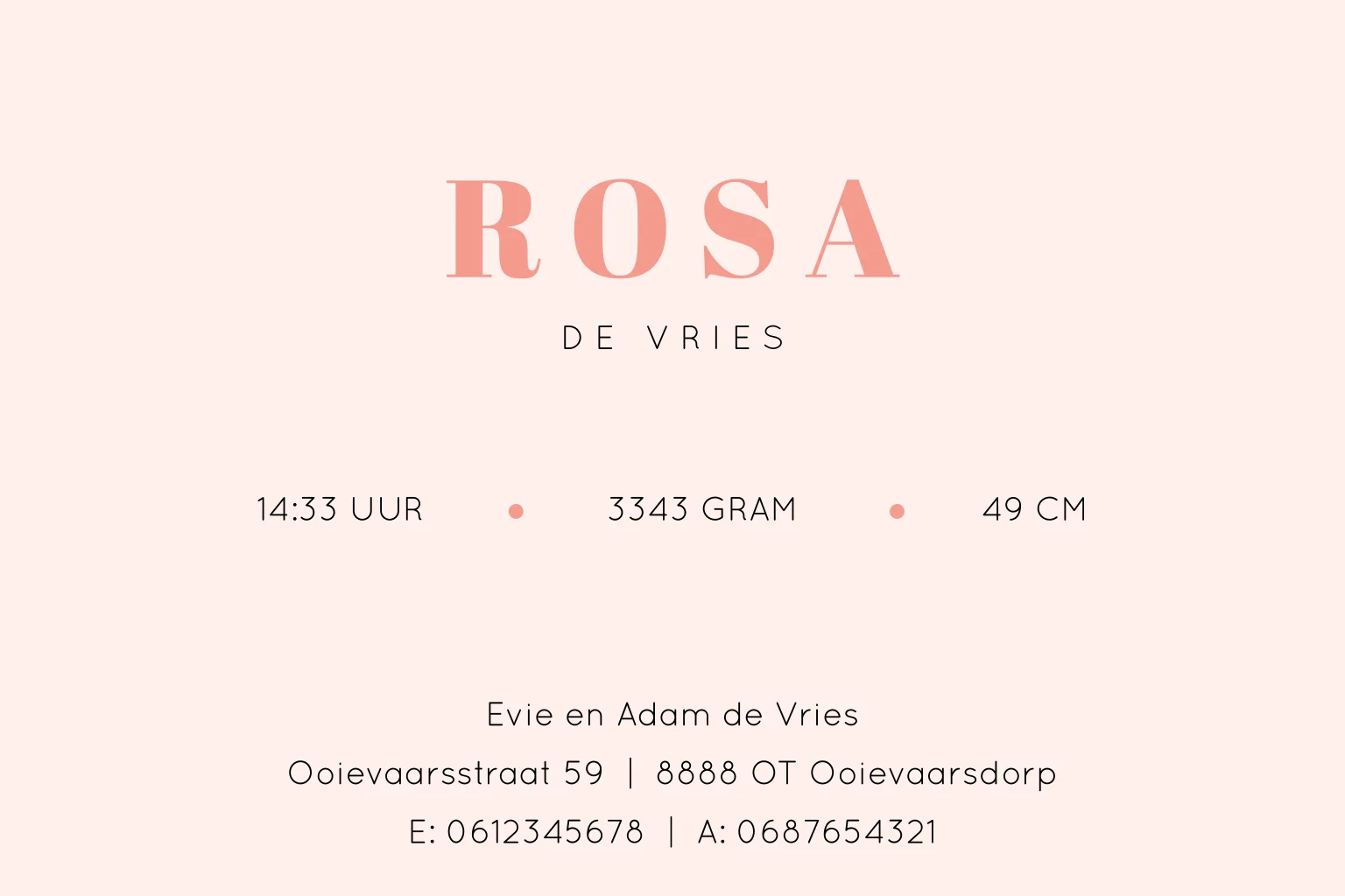 Hoe mooi is dit klassieke geboortekaartje? In een mooie roze kleur. De achtergrond, het lettertype en de kleuren zijn ook volledig naar wens aan te passen. Heb je hulp nodig bij het ontwerpen van jouw ideale kaartje? Stuur gerust een berichtje! Rosa