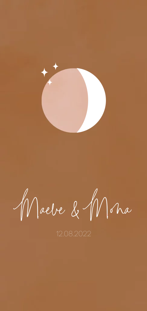 Hoe mooi is dit langwerpige geboortekaartje met maanstand en sterren? Deze is toch perfect voor jouw tweeling? Dit moderne geboortekaartje met maanstand (in goudfolie) van de geboortedatum van jouw kleintje. In mooie roze kleur, maar in onze editor eenvoudig aan te passen naar een andere kleur.