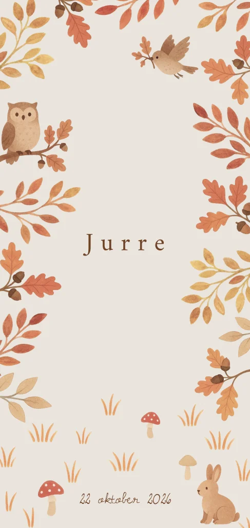 Vrolijk herfst geboortekaartje met bosdieren. Personaliseer het ontwerp nu in onze editor. Jurre