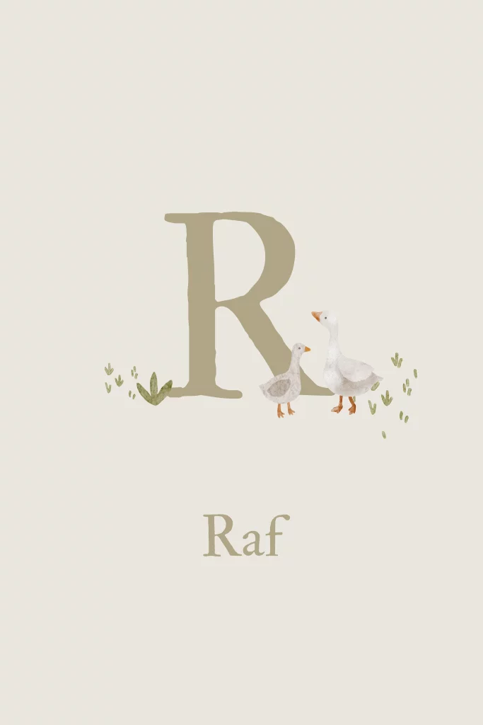 Een vrolijk kaartje met de eerste letter van je baby’s naam en een paar lieve eendjes. Simpel, lief en persoonlijk. Raf
