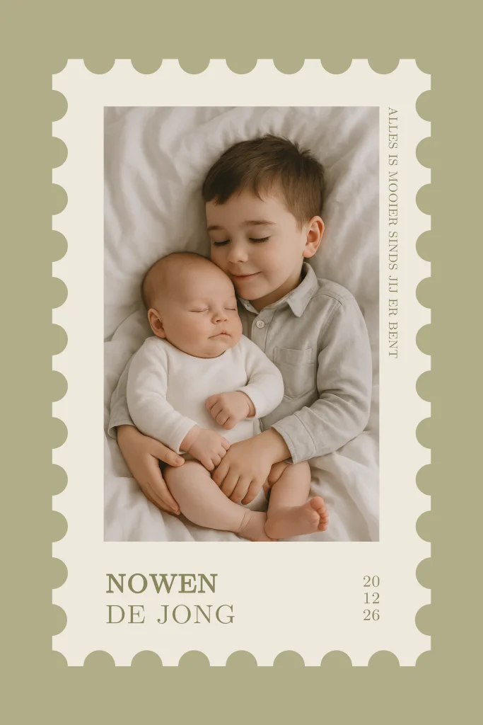 Een kaartje als een echte postzegel, met sierlijke rand. Leuk, speels en net even anders. Nowen