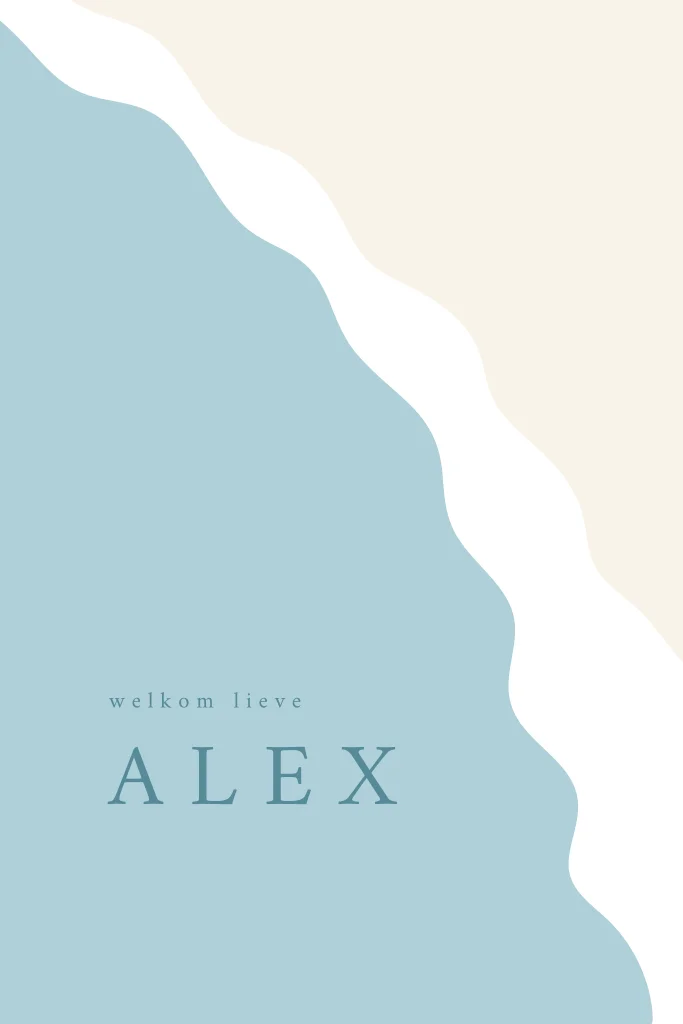 Lief geboortekaartje met zee en strand. Rustig, zomers en een beetje vakantiegevoel. Pas het ontwerp naar wens aan in de editor. Heb je hulp nodig? Stuur me gerust een berichtje, ik help je graag! Alex