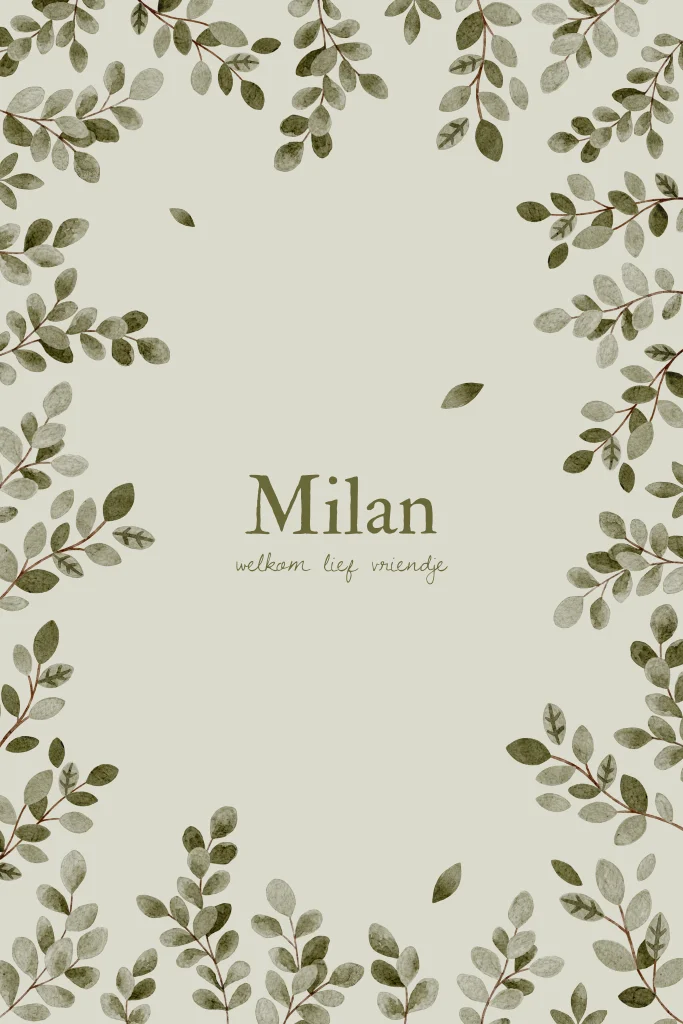 Een fris en natuurlijk geboortekaartje in zachte groentinten, omlijst met een sierlijke rand van blaadjes. Perfect voor ouders die houden van een botanische en rustige uitstraling. Milan