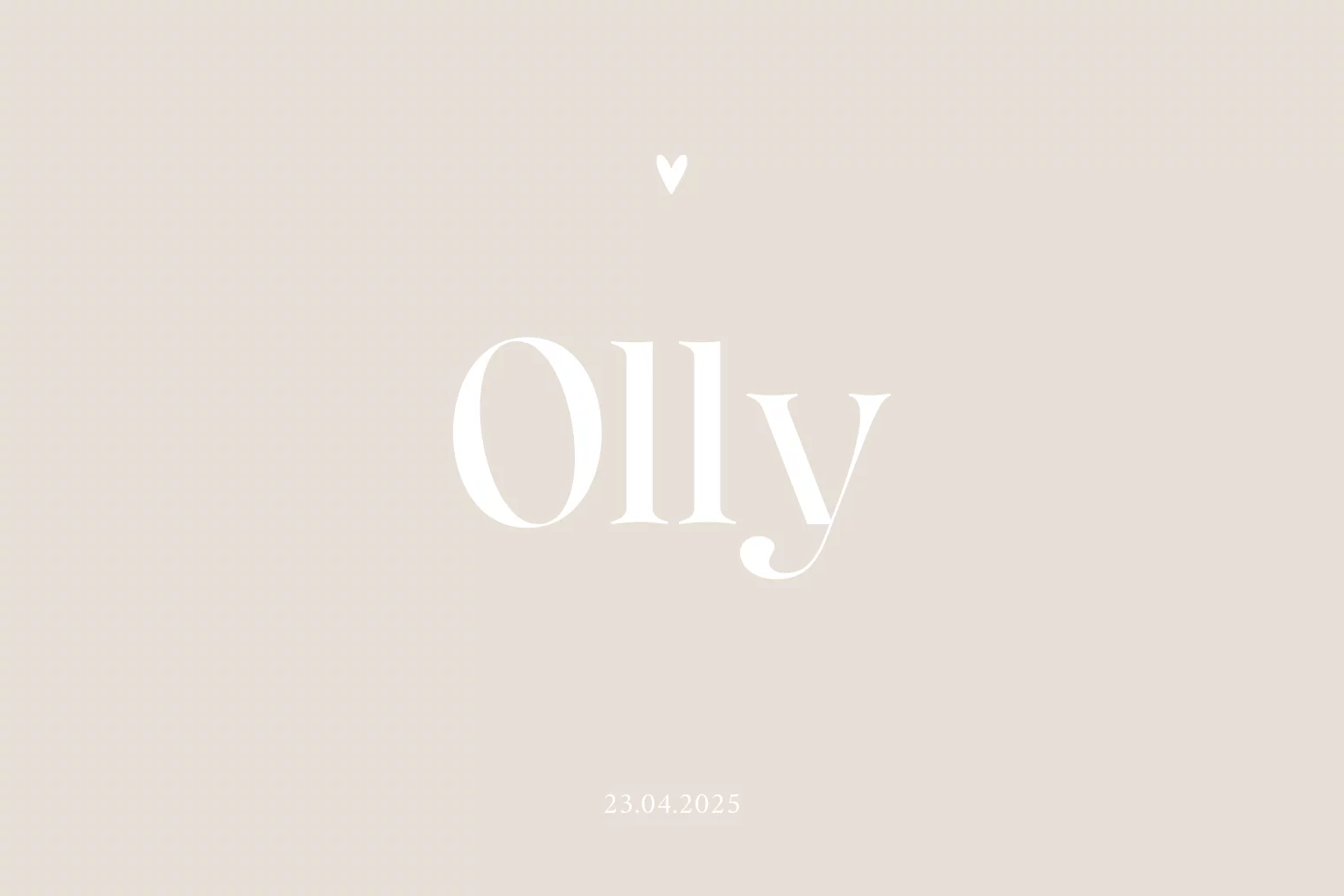 Vier de komst van jullie kleintje met dit minimalistische beige geboortekaartje. De rustige, stijlvolle vormgeving past perfect bij een modern en natuurlijk thema. Gedrukt op duurzaam tulpenbollenpapier krijgt elk kaartje een unieke uitstraling – een liefdevol detail met een vleugje groen. Een tijdloos ontwerp voor een onvergetelijk moment. Olly