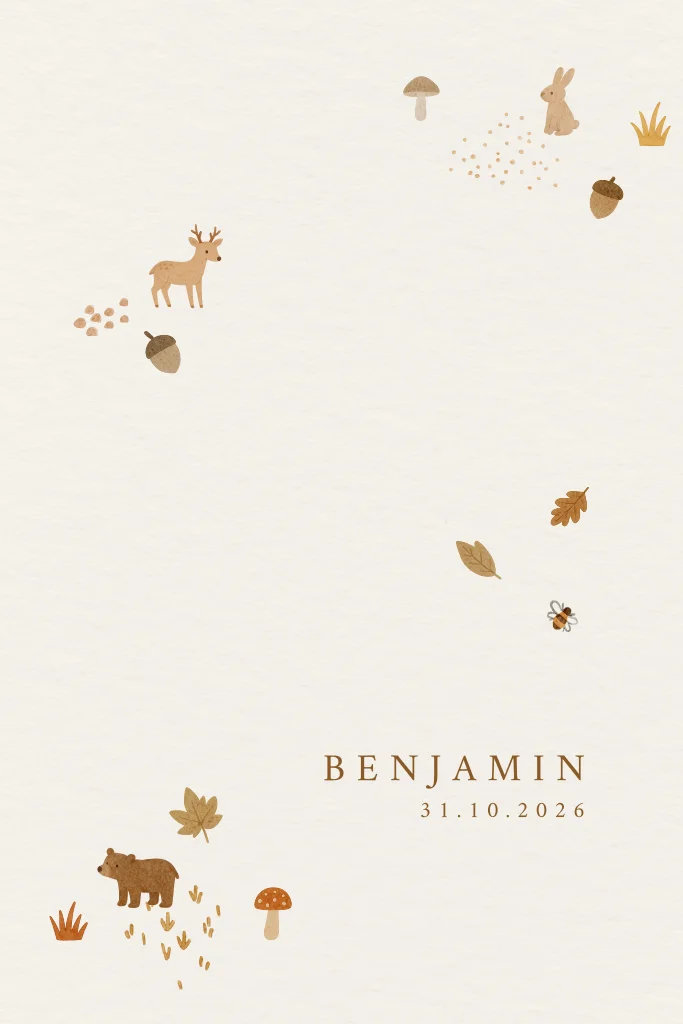 Een fris en eenvoudig geboortekaartje met schattige herfstdieren. Leuk voor een warme sfeer met een moderne uitstraling. Benjamin