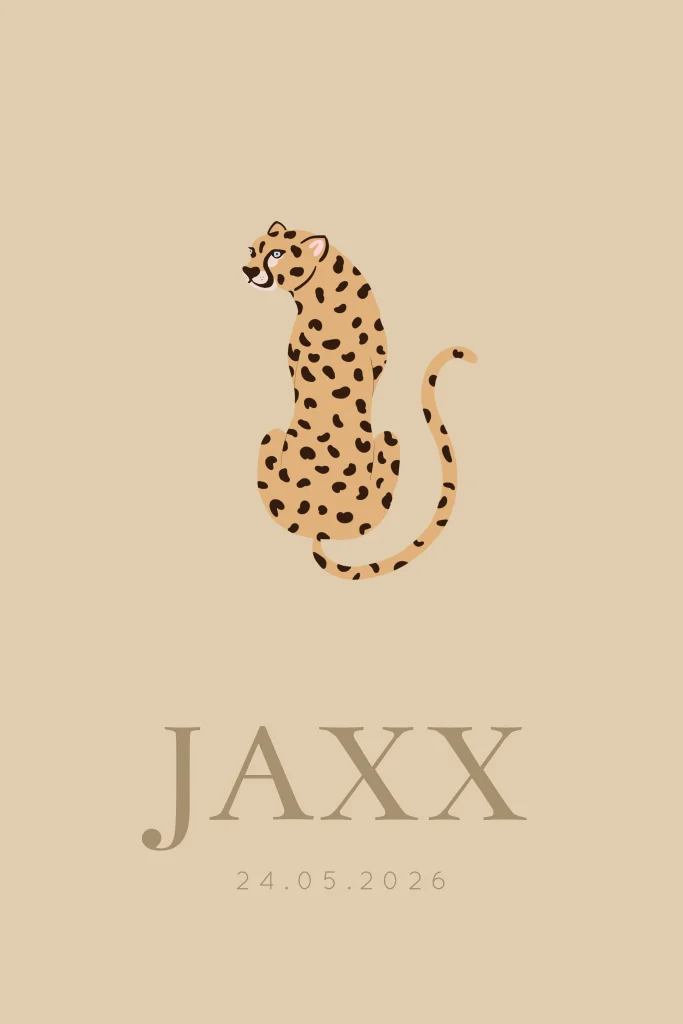 Hou jij van dieren? Dan is dit geboortekaartje met panter perfect voor jouw kleintje. Een beige geboortekaartje en daarom ideaal voor jongens én meisjes. Dit geboortekaartje met een prachtige panter en is perfect voor ouders die op zoek zijn naar een stoer en uniek dieren geboortekaartje. De panter op de voorkant geeft een krachtige uitstraling, terwijl de beige kleur eromheen voor een zachtere touch zorgen. Dit dieren geboortekaartje is geschikt voor zowel jongens als meisjes en kan worden aangepast met de naam van de baby en andere persoonlijke gegevens. Het is een echte blikvanger en zal zeker de aandacht trekken van vrienden en familie. Kies voor een uniek geboortekaartje dat bij jullie past en bestel dit dieren geboortekaartje vandaag nog! De achtergrond, het lettertype en de kleuren zijn volledig naar wens aan te passen. Heb je hulp nodig bij het ontwerpen van jouw ideale kaartje? Stuur gerust een berichtje! Jaxx