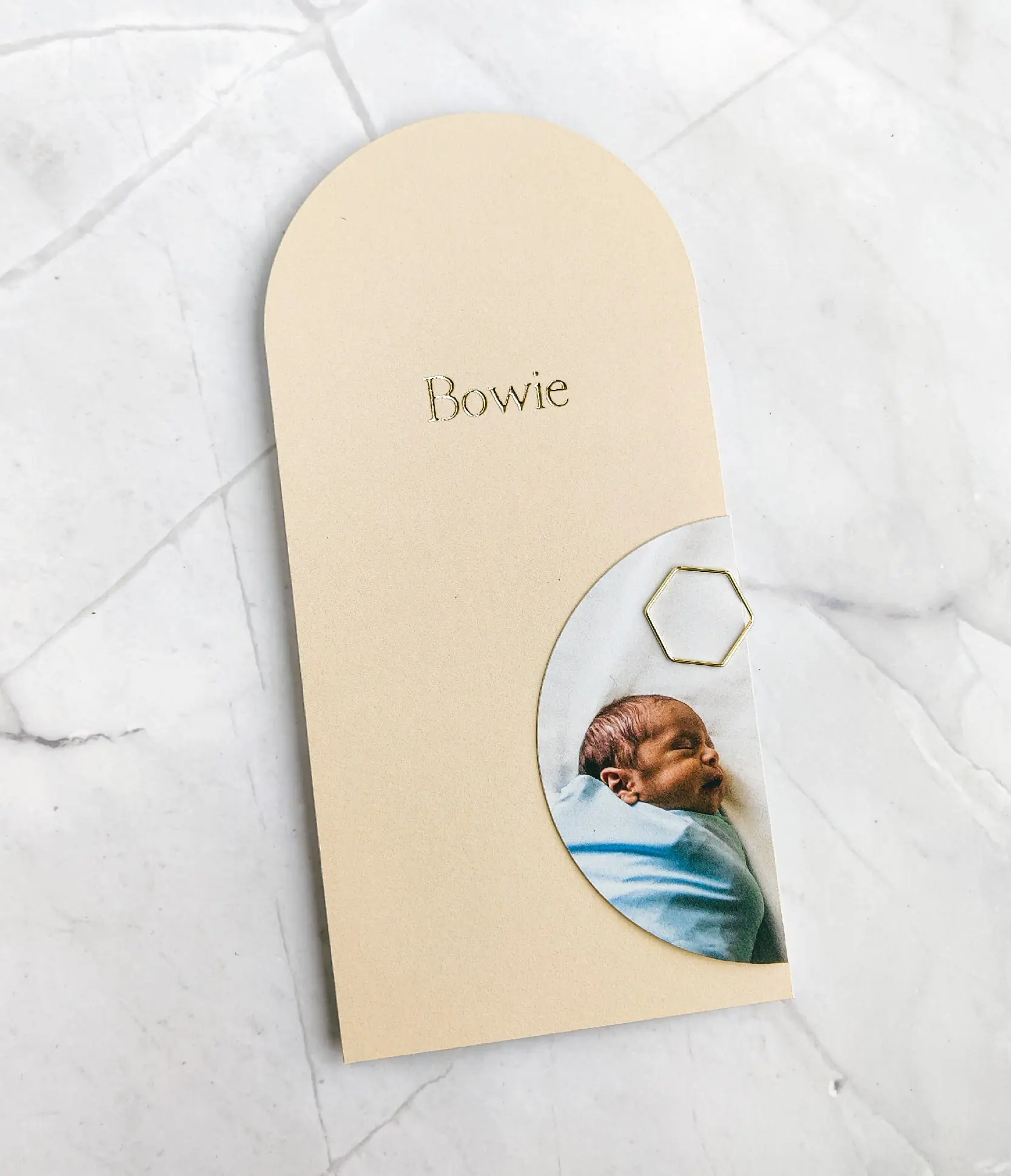 Hoe mooi is dit langwerpige geboortekaartje in boogvorm met los fotolabel. Het labeltje maak je vast met een paperclip. De achtergrond, het lettertype en de kleuren zijn volledig naar wens aan te passen. Heb je hulp nodig bij het ontwerpen van jouw ideale kaartje? Stuur gerust een berichtje! - Kaartje Bowie