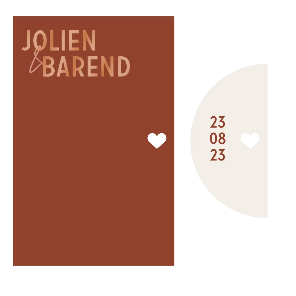 Geef jullie gasten een voorproefje van jullie grote dag met deze stijlvolle uitnodiging met los label met hart detail. De uitnodiging bestaat uit twee elementen: een rechthoekige kaart en een los label met een uitgestanste hartvorm. Bevestig het label aan de kaart met een paperclip, touwtje of lintje om een speelse touch aan jullie uitnodiging te geven. De kaart is volledig aanpasbaar zodat jullie de tekst, kleuren en lettertypes kunnen kiezen die bij jullie passen. Het subtiele hartdetail voegt een romantische en persoonlijke uitstraling toe aan de kaart, terwijl het moderne ontwerp zorgt voor een tijdloze look. Deze uitnodiging is perfect voor koppels die houden van stijlvolle en persoonlijke details.