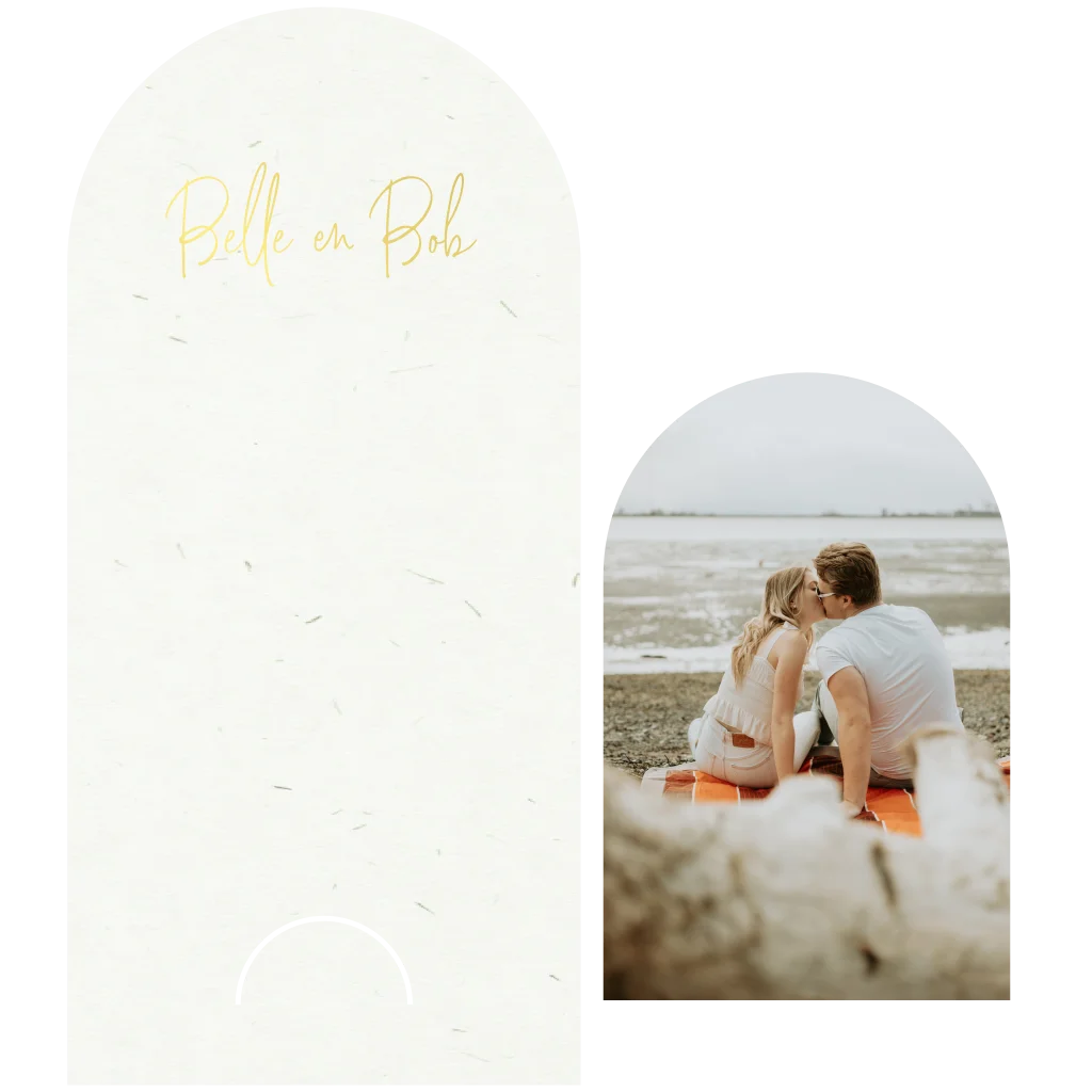 Maak jullie bruiloft compleet met deze luxe uitnodiging die perfect past bij de save the date met fotolabel in bijzondere vorm. In de online editor passen jullie de tekst, lettertypes en kleuren helemaal naar wens aan. De kaart heeft een unieke uitstraling door de bijzondere vorm van het fotolabel.