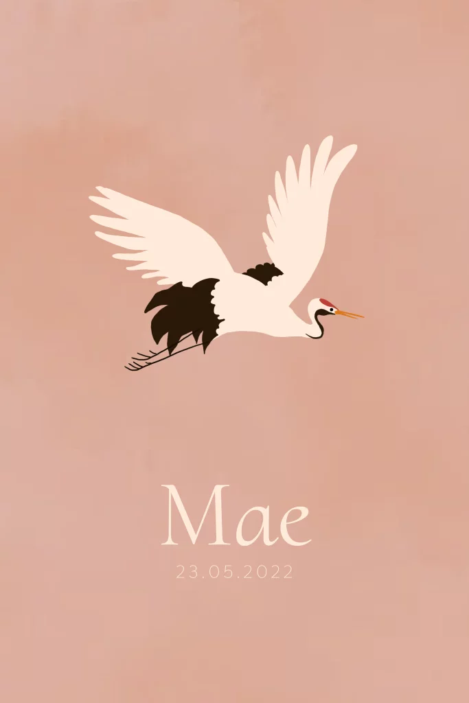 Hoe leuk is deze poster met naam en kraanvogel?! Een roze poster en dus ideaal voor de babykamer van jouw meisje. De achtergrond, het lettertype en de kleuren zijn volledig naar wens aan te passen. Heb je hulp nodig bij het ontwerpen van jouw ideale poster? Stuur gerust een berichtje! Mae
