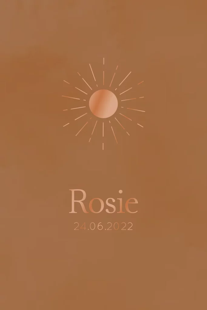 Hoe gaaf is deze poster met een mooie, bruine waterverf achtergrond en afgewerkt met een zon in koperfolie. De achtergrond, het lettertype en de kleuren zijn volledig naar wens aan te passen. Heb je hulp nodig bij het ontwerpen van jouw ideale poster? Stuur gerust een berichtje! Rosie