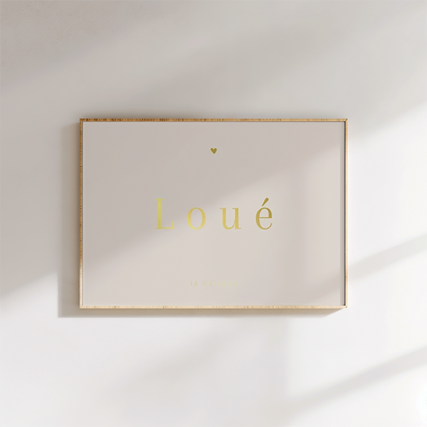 eef de babykamer een elegante uitstraling met onze persoonlijke neutrale beige poster met naam in goudfolie. Deze stijlvolle poster is volledig gepersonaliseerd en voegt een luxe touch toe aan de inrichting. De warme beige tint en de prachtige gouden letters maken het een perfect decoratiestuk voor elke kleine dromer. Ideaal als uniek kraamcadeau of om de kamer van je kleintje een persoonlijke touch te geven! De lijst is niet inbegrepen.