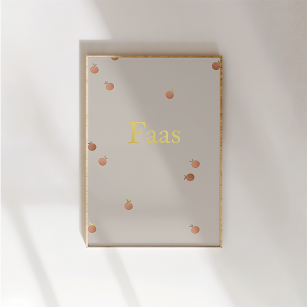 Geef een frisse en fruitige uitstraling aan de babykamer met deze gepersonaliseerde poster vol sinaasappeltjes. Voeg de naam van je kindje toe voor een unieke en vrolijke toevoeging aan het kamertje.