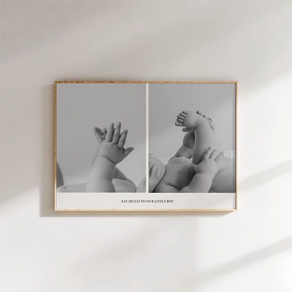 Creëer een unieke sfeer in de babykamer met deze gepersonaliseerde vintage look poster. Verwerk twee prachtige foto's en pas de tekst onderaan aan voor een persoonlijke touch. Perfect voor het vastleggen van dierbare momenten!