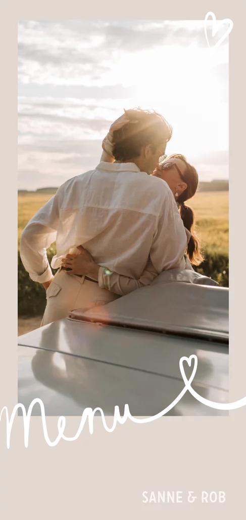 Deze beige menukaart heeft een persoonlijk tintje dankzij de foto en sierlijke tekst. Jullie kunnen zelf een mooie foto selecteren en deze laten afdrukken op de kaart, waardoor het een unieke en persoonlijke touch krijgt. De sierlijke tekst geeft de menukaart een elegante uitstraling die perfect past bij een romantische bruiloft. De kaart is gedrukt op stevig papier en heeft een luxe uitstraling die jullie gasten zeker zullen waarderen. Met deze menukaart maak je jullie bruiloftsdiner helemaal af.