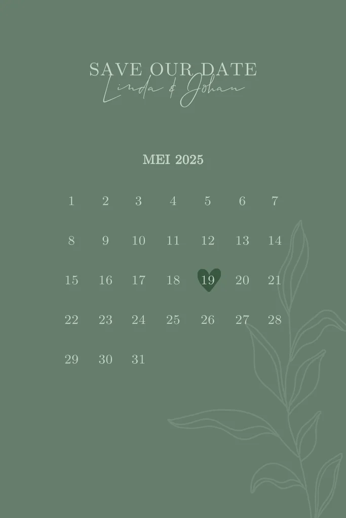 Met deze save the date kaart met kalender en bloementekening kondigen jullie jullie huwelijk aan op een stijlvolle en originele manier. De kaart heeft een prachtige groene achtergrond en een tekening van bloemen die de kaart tot leven brengt. Op de voorkant van de kaart staat een kalender afgebeeld waarop jullie trouwdatum met een hartje gemarkeerd is. Zo weten jullie gasten meteen wanneer jullie grote dag plaatsvindt en kunnen zij deze datum vrijhouden.