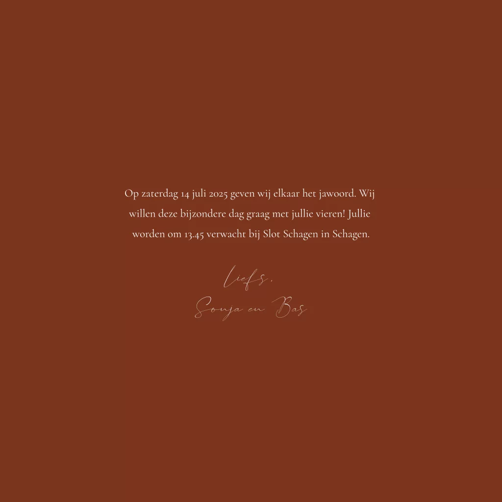 De binnenzijde van de kaart biedt genoeg ruimte voor alle belangrijke informatie over jullie huwelijk, zoals locatie en tijd. Laat jullie gasten zien dat jullie een moderne en eigentijdse bruiloft plannen met deze kaart. Het is het perfecte aandenken aan jullie speciale dag en zal jullie en jullie gasten nog lang bijblijven.