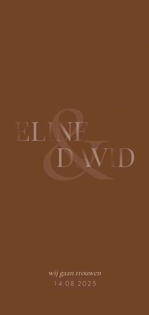 Deze elegante uitnodigingskaart voor jullie huwelijk heeft een bijzonder en luxe ontwerp, dankzij het gebruik van bruine folie voor de namen van het bruidspaar op de voorkant van de kaart. De warme bruine kleur geeft de kaart een chique uitstraling, terwijl het minimalistische ontwerp zorgt voor een eigentijdse en stijlvolle look. De kaart is gedrukt op hoogwaardig papier en is volledig aan te passen in de online editor. Zo kunnen jullie de kleuren, teksten en lettertypes kiezen die perfect passen bij jullie persoonlijke stijl en smaak. Deze uitnodigingskaart straalt klasse en verfijning uit en laat jullie gasten weten dat jullie een onvergetelijke dag plannen. Het is een uitnodiging die hen uitnodigt om samen met jullie de liefde te vieren en te genieten van een dag vol romantiek en gezelligheid. Met deze uitnodigingskaart met jullie namen in bruine folie, laten jullie zien dat jullie de liefde vieren op een stijlvolle en persoonlijke manier.