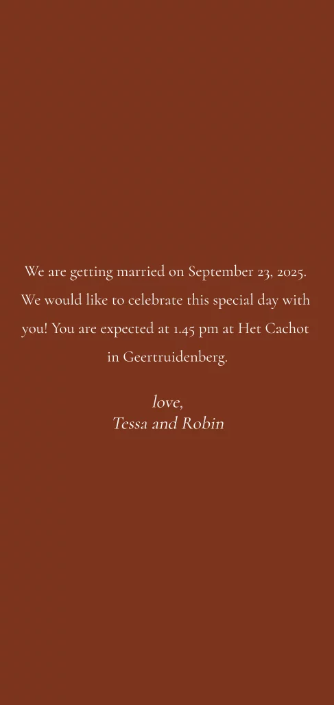 De binnenzijde van de kaart biedt voldoende ruimte voor alle belangrijke informatie over jullie huwelijk, zoals de locatie, tijd en dresscode. Met deze uitnodiging laat je jullie gasten zien dat jullie oog hebben voor detail en dat jullie een stijlvolle en elegante bruiloft plannen.